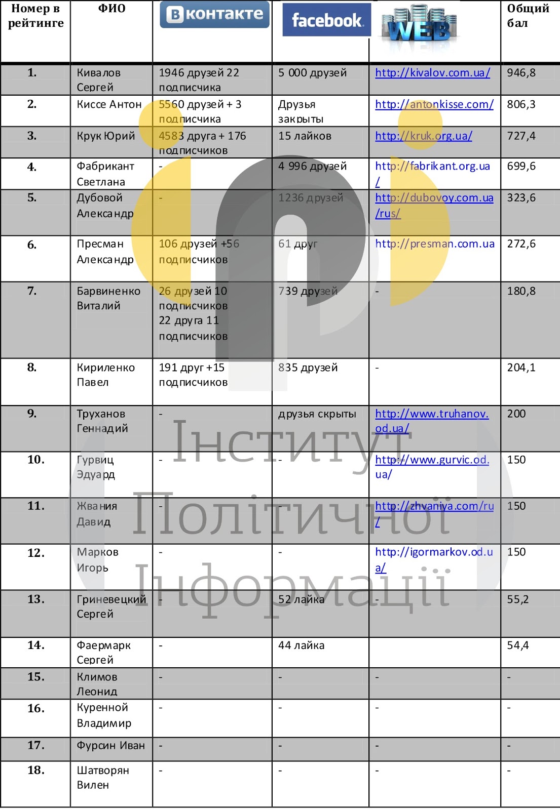 Были проанализированы персональные страницы политиков в наиболее известных социальных сетях, а так же их сайты. В результате анализа было установлено, что из 18 народных депутатов ассоциирующих себя с Одесских регионом, у 15 есть свое представительство в Интернете. Как и ожидалось, наиболее активно проявляют себя в Интернете политики прошедшие в парламент по мажеритарным округам. Так у Сергея Кивалова, Антона Киссе и Юрия Крука, возглавивших рейтинг, есть действующие и достаточно активные профайлы в Facebook и Vkontakte, функционируют собственные сайты. Совсем недалеко от них отстала Светлана Фабрикант, которая, однако, прошла в парламент по партийному списку. Стоит отметить, что Светлана Фабрикант является исключением среди депутатов-списочников, поскольку остальные ее коллеги либо никак не проявляют себя в Сети, либо представлены очень вяло. Средние результаты у Геннадия Труханов и Александра Прессмана, которые без особых усилий выиграли выборы в своих округах. Неожиданно, практически последнее место занял Сергей Гриневецкий, с трудом прошедший в парламент по своему округу в Одессе. У политика есть страница в Facebook, однако, там лишь 2 поста за последние шесть месяцев. Похожие результаты у Давида Жвании. После выборов сайт политика длительный период времени не работал, официальная страница в социальных сетях отсутствует до сих пор. Подобная ситуация у Леонида Климова и Ивана Фурсина. Как отмечают сотрудники Института Политической Информации такое отношение к Интернету у этих политиков объясняется тем, что в сельских округах количество Интернет-пользователей крайне незначительное.